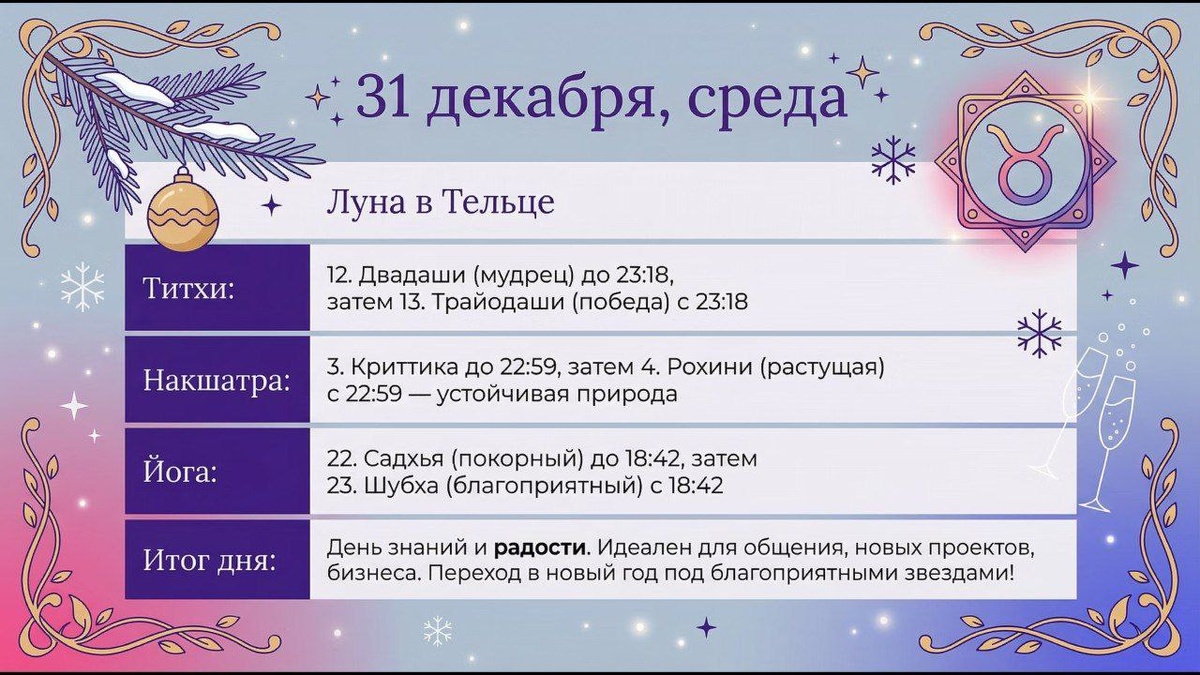 Ну что, встречаем последнюю среду года - день Меркурия, и грех будет сегодня не поумнеть! День смешанный по своей природе, но именно такие дни часто оказываются самыми сильными для трансформации и расширения своего мировоззрения. Ключ дня - не растрачиваем энергию во внешнюю суету, а направляем её внутрь, к более глубокому пониманию себя и подведению итогов. 🌙 Луна в Тельце и накшатре Криттика Утром Луна перешла в знак своей экзальтации - Телец и движется в огненной накшатре Криттика, что добавляет огонька и беспокойства в наш мятущийся ум. 💫Поэтому практикуем: рано утром зажгите свечу, представьте, как ум наполняется светом и любовью, рассеиваются тревоги, в теле и мире распространяется чистая любовь. 🔥Будьте внимательны - огонь Криттики требует уважения: пусть он сожжёт ваше ложное эго, а не материальные ресурсы. Весь день Сарватха Сиддхи йога: потенциал устойчивости и успеха. Комбинация, дающая делам благой итог, что ценно в последний день уходящего года. Пусть сегодняшняя