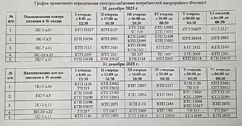 График отключения электричества на Фиоленте до 12 января 2026 года.