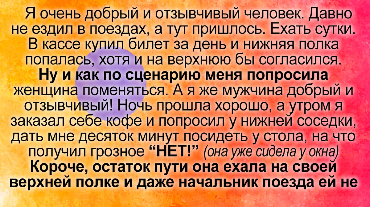 Короче, остаток пути она ехала на своей верхней полке, а я ехал снизу и думал, вот сразу бы отказал и никаких бы проблем бы не было! Но я ведь добрый! Хотел добро сделать, а получил в ответ жесткую и унизительную пощечину!