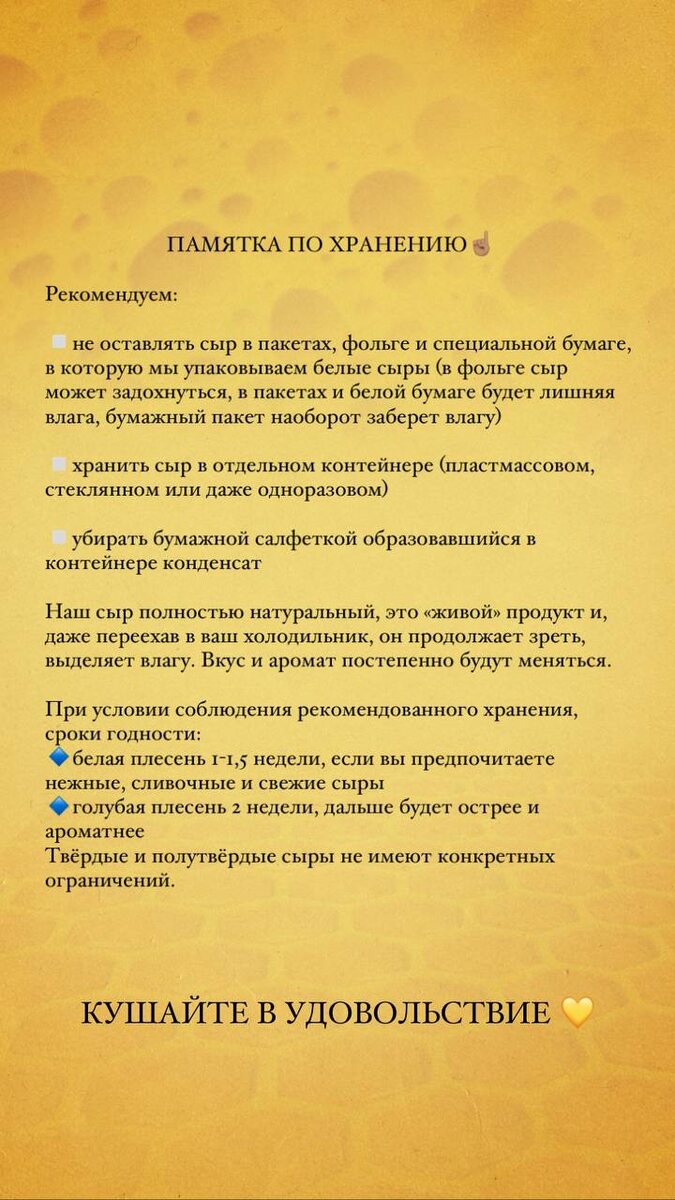 съеден клиентами в машине 🤭 Главное, помните, что на сыр полностью натуральный продукт, и он продолжает «жить» до тех пор, пока вы его не съедите) а значит, зреет и в вашем холодильнике. Если возникают вопросы ❓я на связи, обращайтесь 💌! Все объясню и подскажу в силу своего опыта и знаний😉 Пишите сюда 💁🏽♀️ @zblkova или можете задать свой вопрос в комментариях 👇