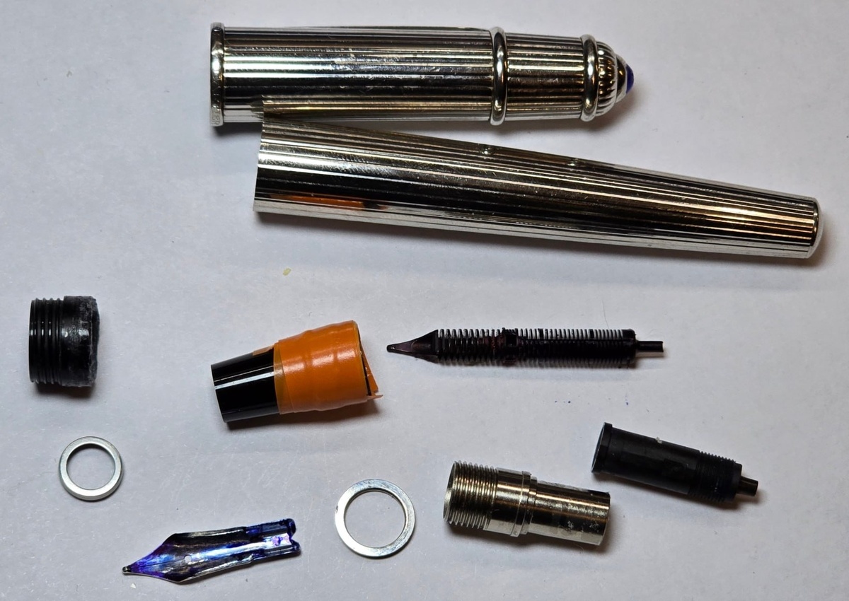 К концу года резко увеличилось количество ручек с диагнозом "проще выкинуть, чем починить". Вот и данный пациент почти из той же серии. Причем тут, как и в ситуации с ранее рассмотренной ручкой Montegrappa Amerigo Vespucci, страшна не сама поломка, а последствия ранее произведенного ремонта. Изначально, каким то образом, у ручки отломилась пластиковая часть корпуса с резьбой, на которую накручивается колпачок и в которую непосредственно ввинчивается грип-секция. Далее ручку попытались склеить, причем, как всегда, самым распространенным и доступным средством - суперклеем( Но что-то пошло не так. Обломок этот приклеился криво, части внутренней резьбы не совпали, при попытке вкрутить секцию она застряла на половине пути. Поскольку клей на тот момент еще не схватился, она не только застряла, но и основательно приклеилась. Далее, судя по всему, была попытка открутить секцию каким-то инструментом, возможно, пассатижами, По крайней мере очень характерные следы остались. Однако, эта попытка, н