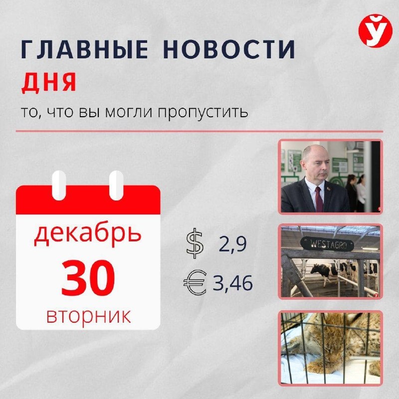 Лукашенко подписал указ о помиловании 22 человек. 📍Президент Беларуси утвердил Государственную инвестиционную программу на 2026 год, подписал закон об изменении налогового законодательства, внес изменения в указ по вопросам документирования населения. 📌Госнаград и Благодарности Президента удостоены 48 представителей различных сфер и три учреждения. На 2026 год гранты Президента Беларуси назначены 42 специалистам. 🏗Утверждена госпрограмма строительства жилья в Беларуси на 2026-2030 годы. 💪🏻В Минобороны Беларуси показали ритуал заступления на боевое дежурство "Орешника". 😡Литовские власти планируют заминировать мосты на границе с Беларусью. ❗️МИД Беларуси сделал заявление по ситуации вокруг Тайваня. 🚄Ночные и без остановок. Между Минском и Москвой увеличат число "Ласточек". 🎤Александр Солодуха рассказал о своих традициях, "звездной" болезни и страшном ДТП. Новый выпуск "Лицом к лицу". 🚈Визитная карточка столицы: Минский железнодорожный вокзал отмечает 25-летие. #главно