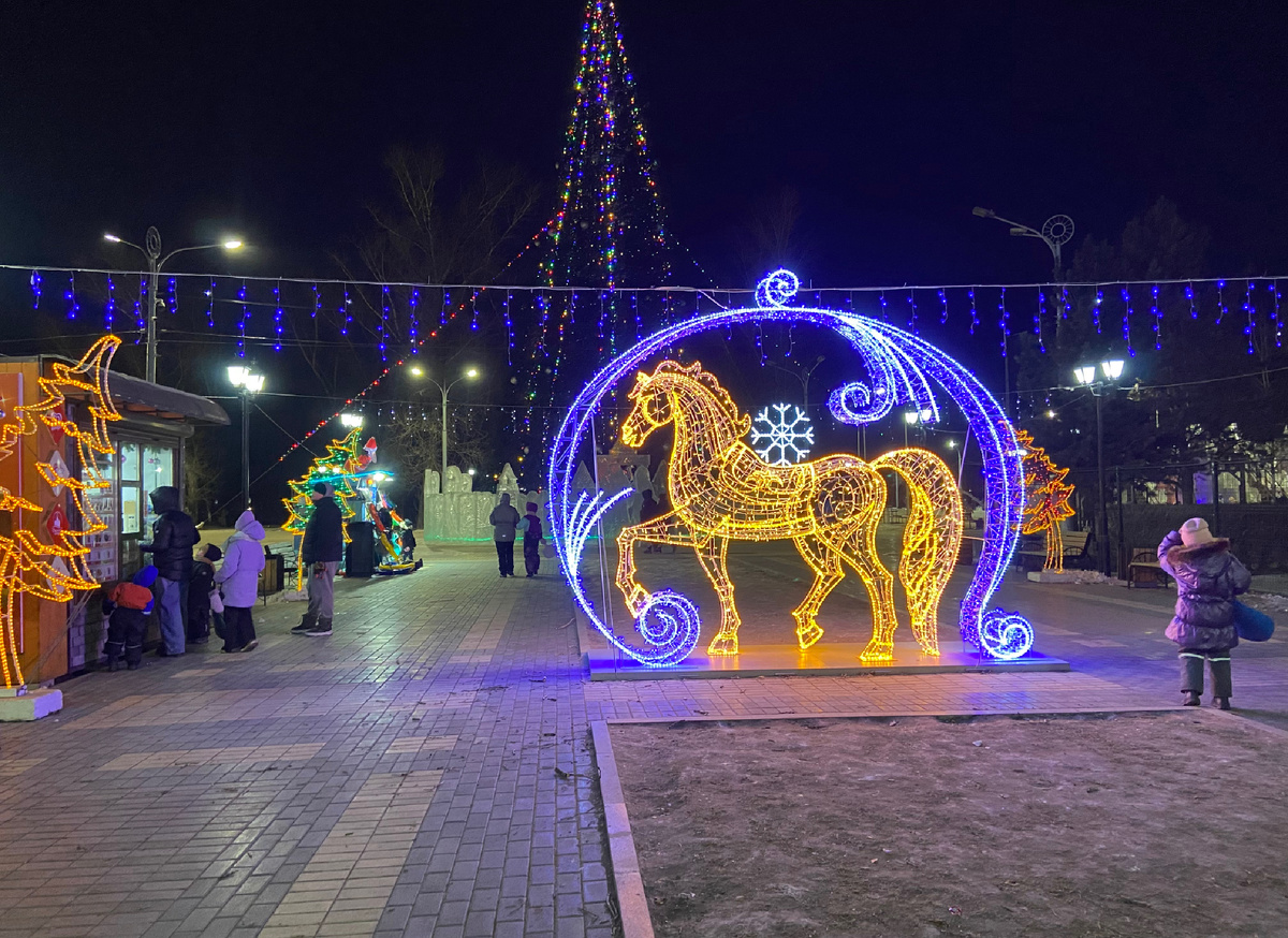 Абакан, столица республики, утопает в сиянии гирлянд, окутывающих деревья и здания в драгоценные нити.