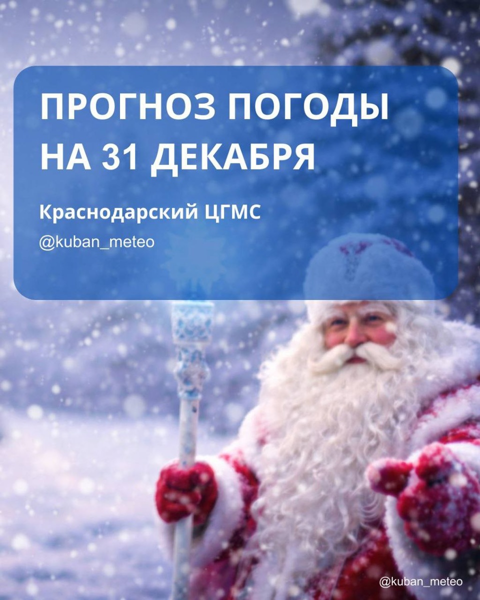 ☁️⛅⛈️ 🎄 Среда, 31 декабря 📍 Краснодарский край Облачно. 🌨 Временами осадки в виде дождя, мокрого снега, снега, местами сильные. ⚠️ До конца суток 31.12 — гололедно-изморозевое отложение в сочетании с сильным ветром с порывами 15–20 м/с, в отдельных районах с порывами 20–25 м/с (КМЯ). ⚠️ В отдельных районах очень сильные осадки в виде мокрого снега, дождя со снегом (ОЯ), очень сильный снег (ОЯ), сильное налипание мокрого снега на проводах и деревьях (ОЯ), сильный гололёд (ОЯ), сильное гололедно-изморозевое отложение (ОЯ). 🌬 Метель, на дорогах снежные заносы, гололедица. 💨 Ветер западной четверти 4–9 м/с, местами порывы 12–14 м/с. 🌡 Температура воздуха: ночью 0…–5°, в юго-восточных предгорных районах –3…–8°; днём –3…+2°; 🏔 в горах ночью и днём –8…–13°. 🌊 На Черноморском побережье Переменная облачность. 🌨 Местами осадки в виде дождя, мокрого снега, снега, местами сильные. 💨 Ветер западной четверти 6–11 м/с, местами порывы 12–14 м/с, ночью 18–23 м/с. 🌡 Температура воздуха ночь