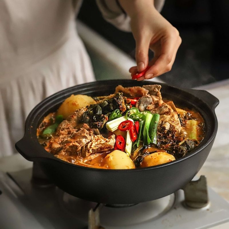 Гамчжатхан — это насыщенный и сытный корейский суп из свиных костей, приготовленный на медленном огне с нежными костями свиной шеи, картофелем и приправленной зеленью в насыщенном, ароматном бульоне. Приправленный порошком семян периллы, гочутгару и двенчжаном, этот ароматный суп является любимым блюдом комфорта с пряным, ореховым послевкусием.