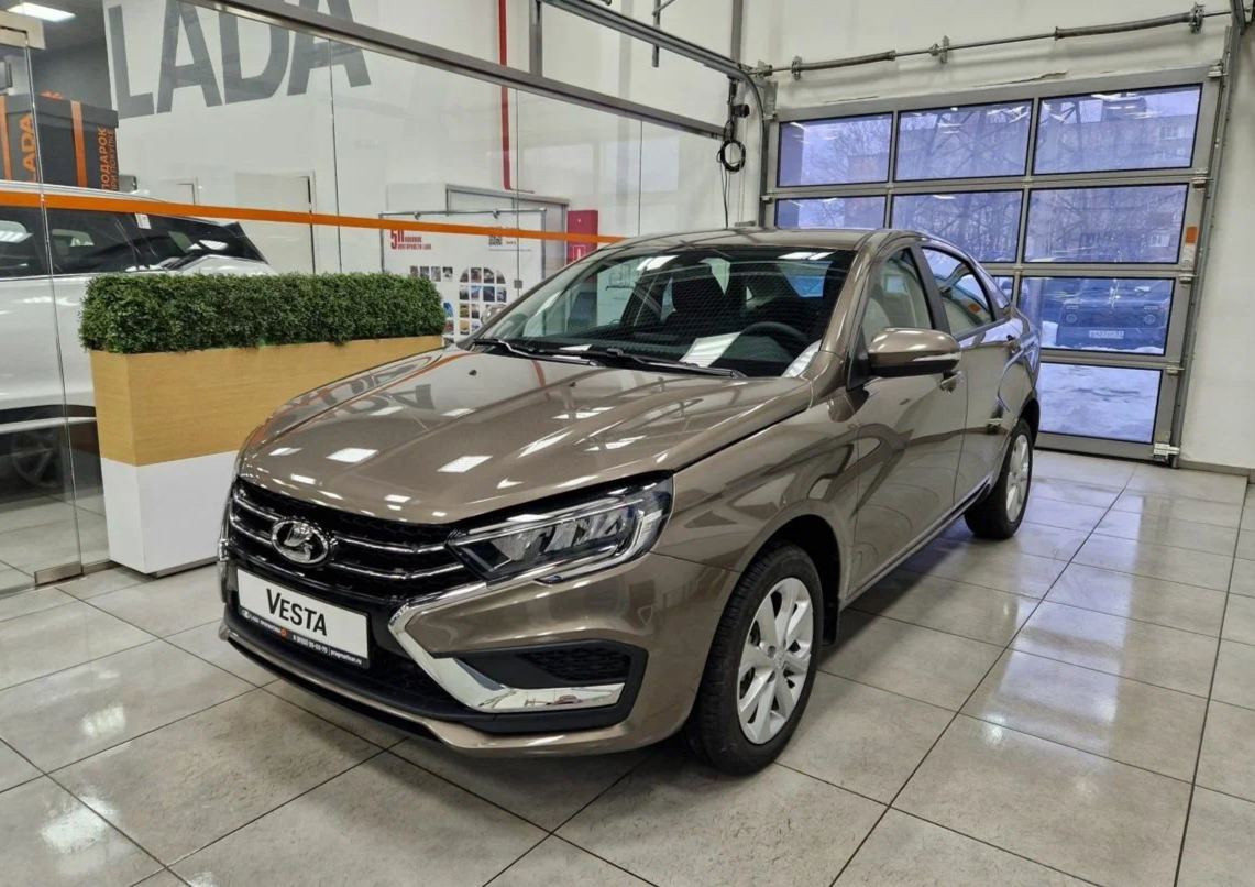 Самая дешёвая Веста из наличия — это седан коричневого цвета, мотор 106 л.с., коробка 5-ступенчатая механическая, комплектация Enjoy с пакетом Enjoy Pro. Колёсные диски литые 16. Передняя и задняя оптика светодиодная. Зеркала и наружные дверные ручки окрашены в цвет кузова. В зеркала интегрированы указатели поворотов. Лобовое стекло с электроподогревом все поверхности, форсунки омывателей оснащены подогревом. На крыше чёрная глянцевая антенна в форме плавника. Датчики парковки лишь задние, есть камера заднего вида.