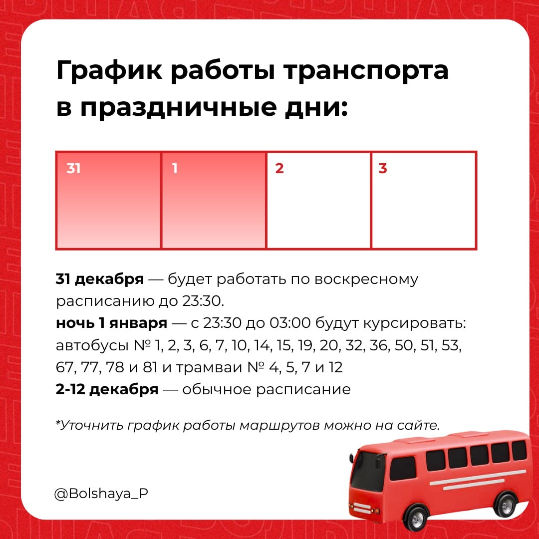 🚃 Все праздничные дни транспорт работает по расписанию выходного дня. Количество автобусов на маршрутах меньше не станет. При этом в новогоднюю ночь автобусы и трамваи ходят аж до 3х ночи — поэтому домой вернуться успеете. ❤️ Подписаться | Предложить новость | Дать «буст» | Мы в MAX