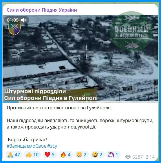 В очередной попытке опровергнуть контроль ВС РФ над Гуляйполем ВСУ сняли видео со своими солдатами в поселке Зализничное в 3 километра к западу от города, выдав эти кадры за передвижение по самому Гуляйполю. Это уже не первая попытка фальсификаций Сил Обороны Юга ВСУ в Гуляйполе. Месяц назад их официальный канал и канал 33-го штурмового полка публиковали видео лета 2025 года с продвижением штурмовиков 33-го ОШП в Теткино Курской области, выдавая его за действия внутри Гуляйполя. Интересно, что к аналогичному неуклюжему способу "опровержений" об успехах уже ВСУ в Купянске прибегала и российская ГВ "Запад", отсняв видео в селе Таволжанка в 15 км от города, заявив, что это Купянск. Видимо, девиз "никогда не сдавайся - позорься до конца" является общим для некоторых как российских, так украинских штабов. Военный Осведомитель
