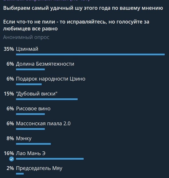 ! 🐸 Лучший шу: Цзинмай Лучший шэн: Покой Лучший красный: Дикий табак Лучший улун: Каменное молоко / Чао Ча Лучший белый: Копчёный белый персик Лучший зеленый: Фермерский Лучший гибрид: Дяньхун шу И финал. Лучший чай вне категорий: Цзинмай Жаль в 24 году до такого не догадались! Но может быть еще сделаем🥳