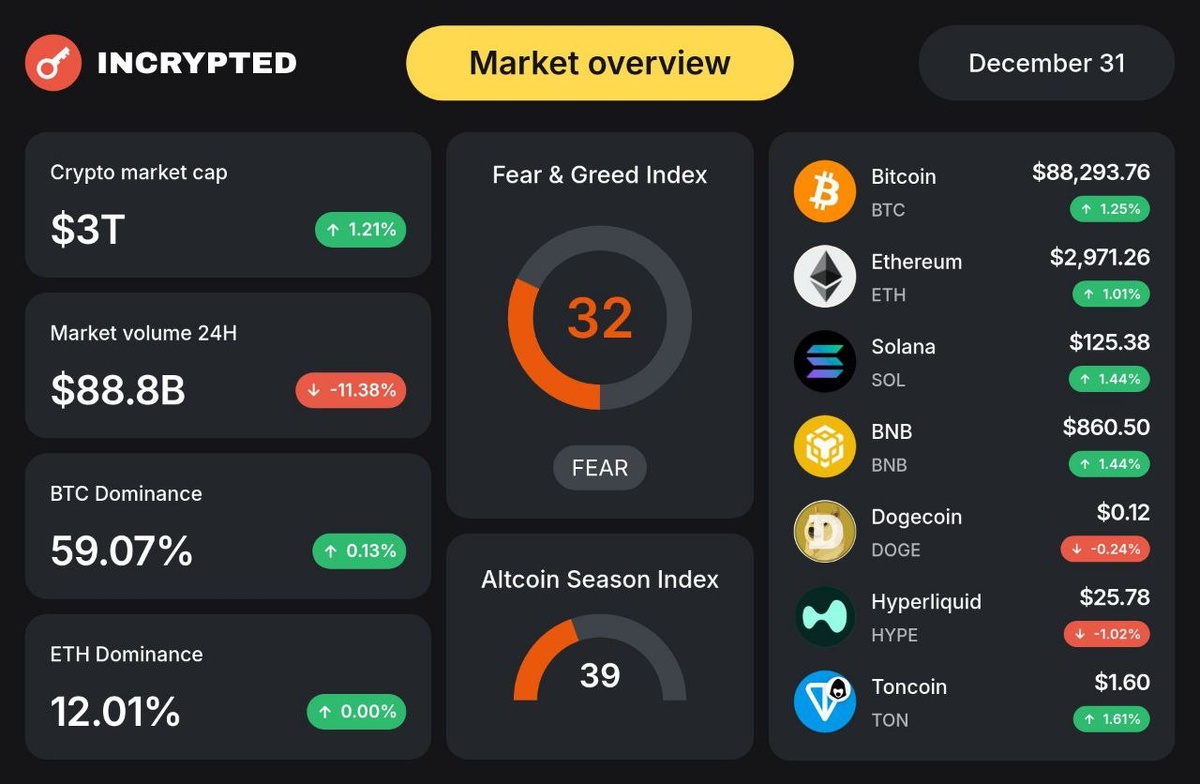 - BTC ≈$88 300 (+1.25%) - ETH ≈$2 970 (+1.01%) - SOL ≈$126 (+1.44%) - Капитализация рынка ≈$3T (+1.21%) - Индекс страха и жадности: 32 (страх) - Индекс альтсезона: 39 Детальнее в инфографике.