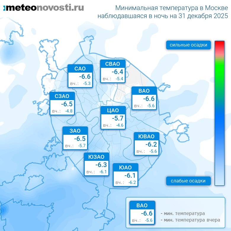 Минимальная температура ночью в Москве оказалась на 1°C выше нормы, что в пределах обычных значений. Самая низкая температура -6.6°C была зафиксирована в 9 часов на севере города, а теплее всего было в центре: -4.9°C. Разница по минимальной температуре в разных частях столицы составила за минувшую ночь 1.7°C. Максимальные порывы ветра ночью достигали 5 м/с. Атмосферное давление за ночь повысилось с 727 до 728 мм.рт.ст. Повсеместно прошли небольшие осадки. Больше всего осадков выпало на юге города – 2.6 мм. Самая холодная ночь в Москве 31 декабря наблюдалась в 1978 году, когда минимальная температура составила -37.9°C, а самая теплая в 2013 году с температурой +1.7°C. Перейти на сайт Прогноз погоды на 14 дней