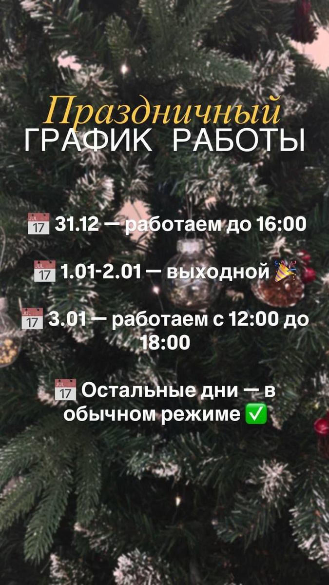 🤍 Чтобы вы могли всё спланировать спокойно ⏰ 📅 31.12 — работаем до 16:00 📅 1.01-2.01— выходной 🎉 📅 3.01 — работаем с 12:00 до 18:00 📅 Остальные дни — в обычном режиме ✅ 🎁 Подарочные карты вы можете приобрести онлайн — удобно, быстро и в любое время Идеальный вариант, если подарок нужен «на вчера» 🤍 Праздники — это про отдых, а мы рядом, когда хочется заботы и расслабления 💆♀️✨ Запись лучше планировать заранее 🌿 Написать в WhatsApp или Телеграмм тел. 89143641717 На сайте 👈