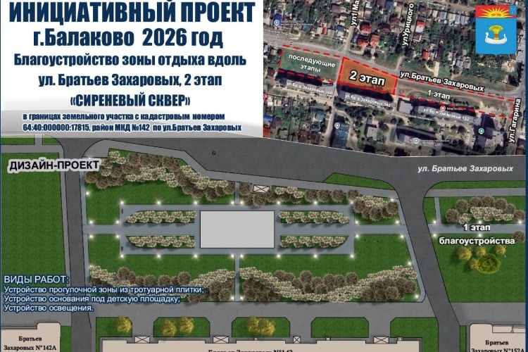 Инициаторами проекта выступила группа жителей в составе 5 человек, руководителем которой является Бахарева Н.А., депутат Совета МО город Балаково по одномандатному избирательному округу №3. Благоустройство территории вдоль ул. Братьев Захаровых со стороны многоквартирных домов №152,142,140 планируется выполнить в несколько этапов. 1 этап стартовал в 2025 году – за счет средств местного бюджета и спонсорских средств БФ АО «Апатит» выполнено благоустройство вдоль многоквартирного дома №152 по улице Братьев Захаровых (в границах земельного участка с кадастровым номером участка 64:40:000000:17815). В 2026 году планируется продолжить работы по благоустройству в рамках инициативного проекта – за счет бюджетных и спонсорских средств, так и за счет имущественного и трудового участия всех привлекаемых сторон к реализации проекта: - устройство прогулочной зоны из тротуарной плитки; - устройство основания под детскую площадку; - устройство освещения, - завоз и планировка грунта, - высадка зеленых