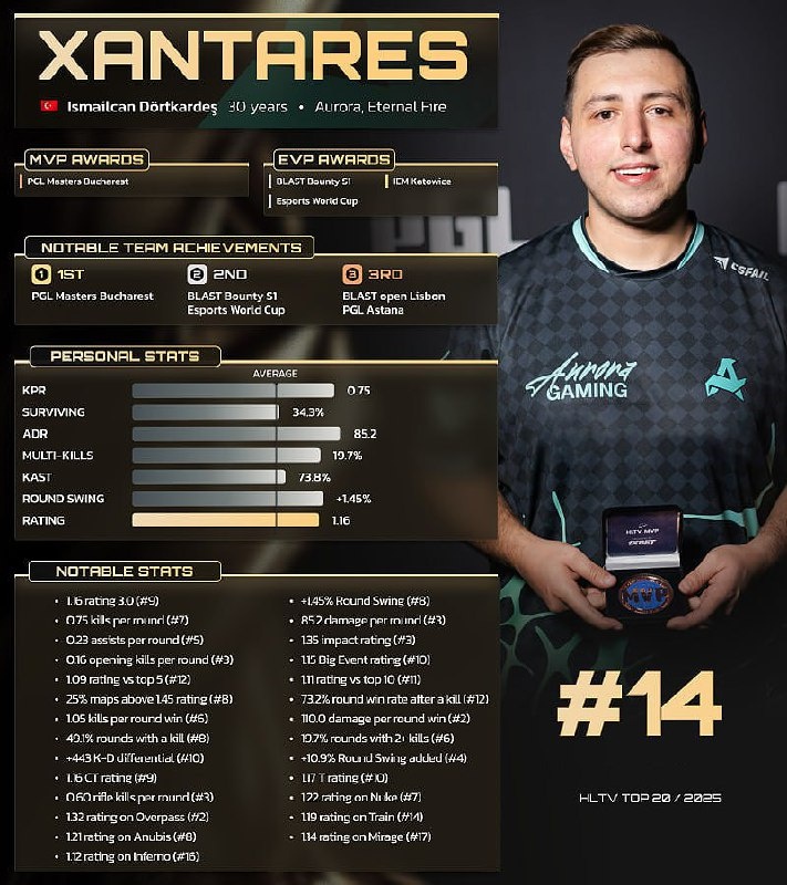 🇷🇺 XANTARES занял 14 место в списке лучших игроков 2025 года по версии HLTV