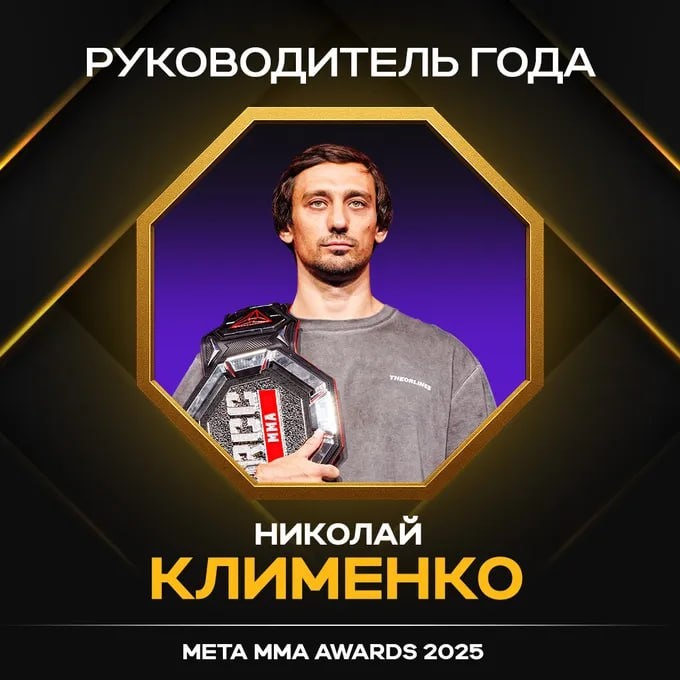 Второй год подряд победа остаётся за Николаем Клименко. Руководитель RCC вновь стал триумфатором одной из ключевых номинаций премии Meta MMA Awards, подтвердив статус одного из главных управленцев в российском ММА. 📌 Итоги голосования: 1️⃣ Николай Клименко — 49 баллов 2️⃣ Данил Алеев — 40 3️⃣ Асланбек Бадаев — 35 Под руководством Клименко лига RCC продолжила уверенный рост и расширение. В 2025 году промоушен активно проводил турниры по ММА, кикбоксингу и кулачным боям, а также вывел на новый уровень популярности Владислава «Белаза» Ковалева. Отдельного внимания заслуживает выход RCC на «УГМК-Арену» вместимостью 12,5 тысячи зрителей, внедрение чемпионских поясов в ММА и стабильно высокий стандарт продакшена — качественная ТВ-картинка и продуманное оформление арены стали визитной карточкой лиги. 🔥 Вишенка на торте — турнир RCC Intro 36, где все 13 поединков уместились всего в 53 минуты. Ярко, динамично и без пауз. Николай Клименко вновь доказал: системная работа и стратегическое м
