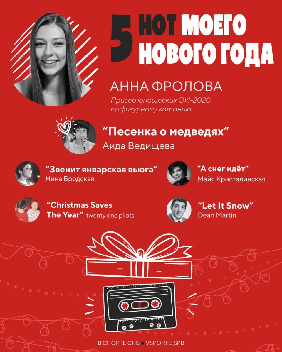 🎶 🎄 Новый год уже очень близко! На протяжении почти двух недель мы каждый день будем делиться с вами музыкой, которую наши прекрасные спортсмены любят слушать в новогодние праздники. ⛸ Первый плейлист подготовила для нас одна из лучших фигуристок России Анна Фролова из Академии фигурного катания! 📱 Слушать плейлист у нас в ВК. 🙌Будь ВСпорте!