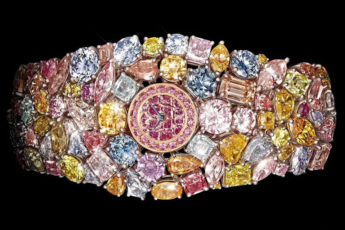 … Вот так выглядят самые дорогие часы в мире. Это «Graff Diamonds Hallucination». Их создали в 2014 году, сейчас стоимость оценивается в 55 млн. долларов. 110 карат редких крупных цветных бриллиантов самых разных цветов на браслете из платины. Фото https://jewellerymag.ru/