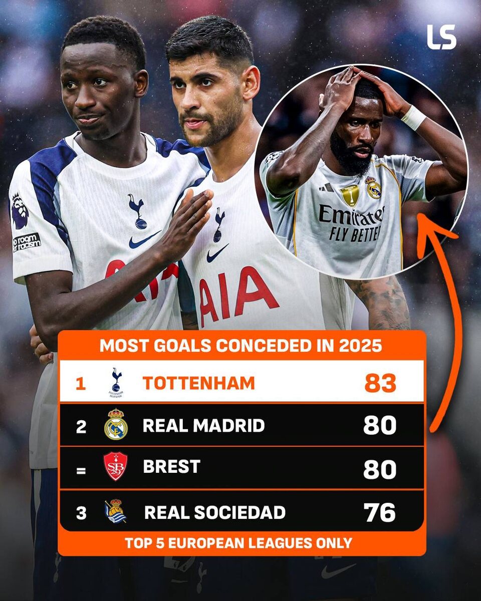 Только «Тоттенхэм» пропустил больше голов, чем «Реал Мадрид» в 2025 году в топ-5 лигах Европы 🫣