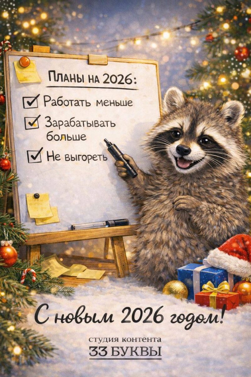 ! Студия контента «33 буквы» поздравляет вас с Новым 2026 годом! Для нас уходящий год стал днем рождения - именно в августе мы приняли решение открыть студию. За три месяца работы нам удалось реализовать несколько крупных проектов, познакомиться с очень интересными людьми, написать несколько десятков тысяч букв, которые принесли нашим клиентам несколько десятков тысяч рублей (точную цифру мы озвучивать не имеем права 😜). Мы желаем всем в Новом Году сил и радости, новых и интересных целей, самореализации, стабильности и взаимопонимания! Ваши Ольга и Настя. С праздником!