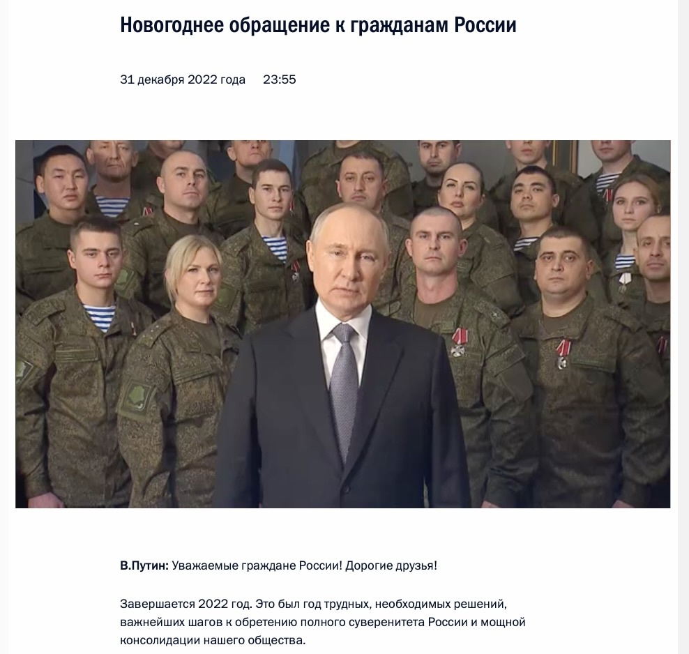 31.12.2022: Новогоднее обращение президента РФ Путина к жителям страны было записано не на фоне Кремля, а в окружении военнослужащих ЮВО; Российское командование включило 1-й (НМ ДНР) и 2-й (НМ ЛНР) армейские корпуса в состав ВС РФ; Состоялся самый крупный обмен военнопленными с начала СВО – 82 на 140 человек.