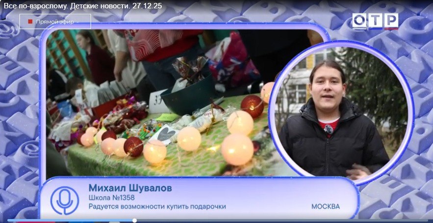! На телеканале ОТР вышел репортаж с Рождественской благотворительной ярмарки в нашей школе! Съёмочную группу представляли наши талантливые корреспонденты из медиацентра «В фокусе» — Михаил Шувалов и Даниил Бурый. Гордимся! 🎥✨ Смотрите репортаж на ОТР — и спасибо всем, кто помог сделать ярмарку такой тёплой и доброй! ❤️ https://otr-online.ru/programmy/vsyo-po-vzroslomu/shkolnaya-rozhdestvenskaya-yarmarka-novogodnii-koncert-v-shkole-premera-spektaklya-volshebnik-izumrudnogo-goroda-96165.html #МедиацентрВФокусе #ОТР #Школа1358 #ДОНМ #ТалантливыеДетиМосквы