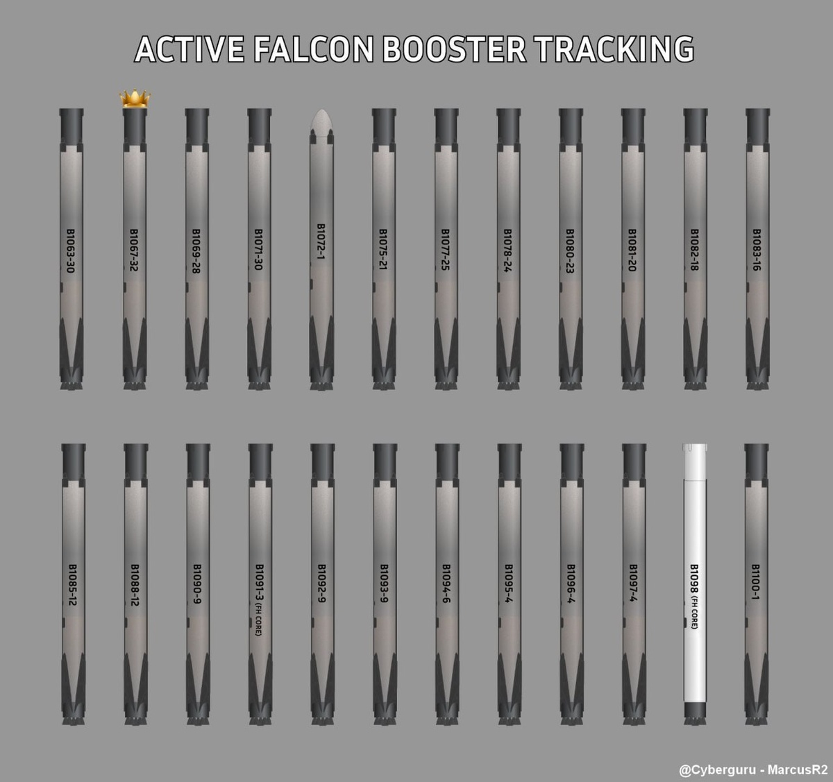 ⚡️ Сейчас флот ускорителей Falcon состоит из 24-х ступеней: 21-й Falcon 9 и 3-х Falcon Heavy