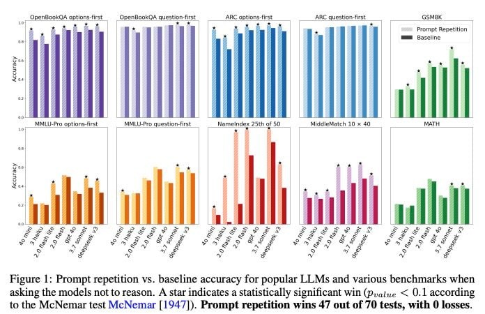 повторять один и тот же промпт к ИИ. Звучит как полная ерунда, правда? А вот и нет! Результат вышел офигенным: почти все модели Gemini, GPT, Claude, Deepseek и прочие - после дубляжа начали отвечать заметно точнее. Без потери скорости и без всякой словесной воды. Фишка в том, что когда ИИ дважды получает один и тот же промпт, он начинает лучше “видеть” связи между словами. Магия работает только с обычными моделями - reasoning-версии и так повторяют запрос внутри себя, чтобы подумать получше. Но затраты вырастут, учтите. А вообще тема интересная. Русский ИТ бизнес