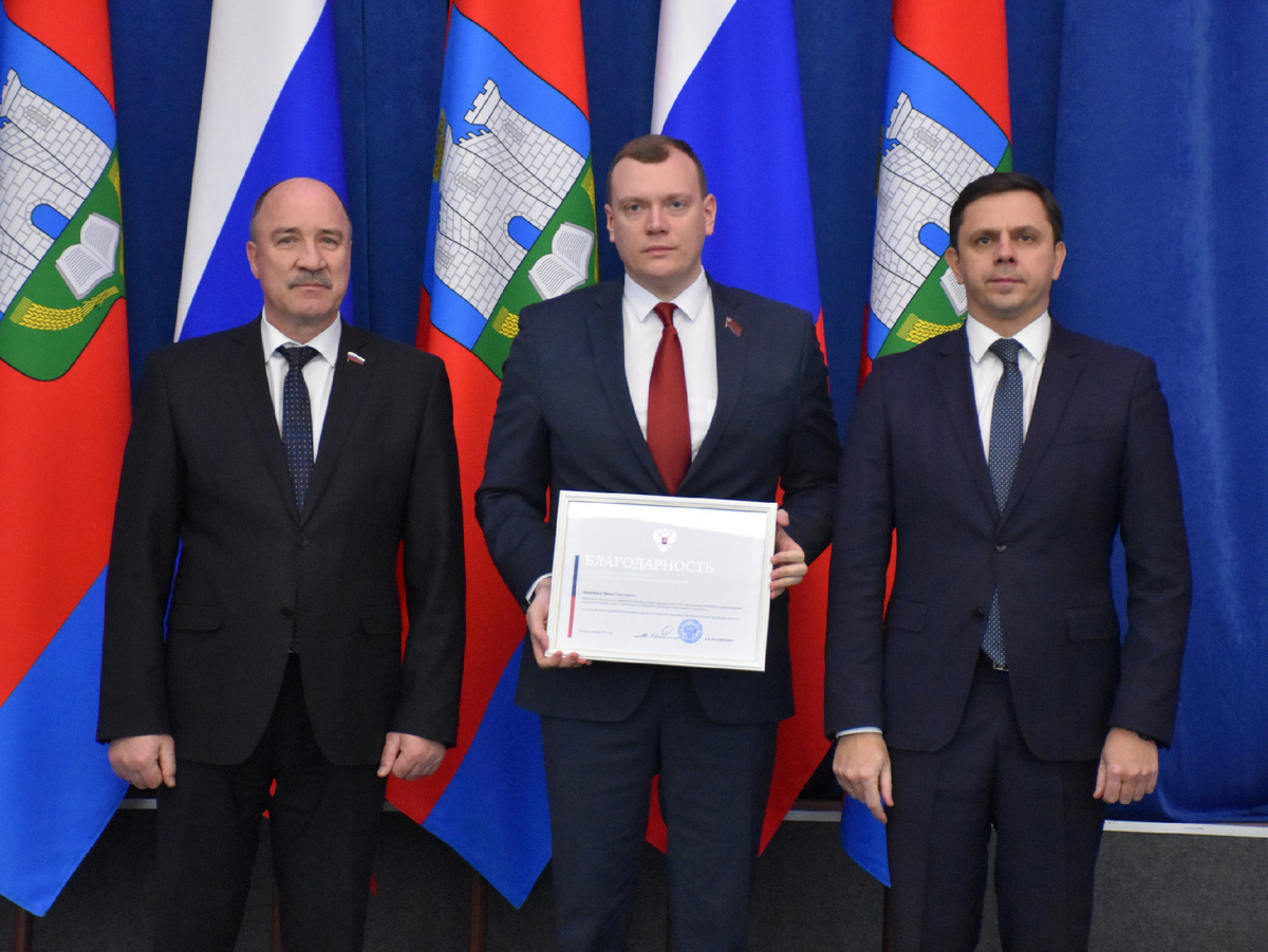 Уважаемые товарищи, в канун Нового года был награждён Благодарностью Председателя Совета Федерации Федерального Собрания Российской Федерации В. И. Матвиенко за большой вклад в развитие парламентаризма и совершенствование законодательства Орловской области.