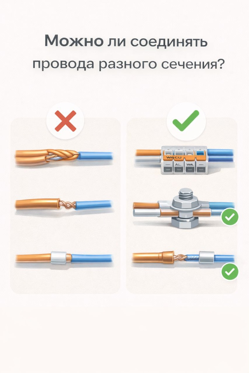 ? Коротко: можно, но с правильным способом соединения. ❌ Ошибка: Просто скрутить тонкий и толстый провод. Такой контакт: быстро нагревается ослабевает со временем может привести к оплавлению и пожару ✅ Как правильно: клеммы WAGO, рассчитанные на разные сечения болтовое соединение (шайбы + гровер) опрессовка гильзами (если есть инструмент) ⚠️ Важно: оба провода должны быть зачищены правильно соединение должно быть рассчитано на ток линии никаких «временных решений» в коробках 📌 Запомни: Разное сечение — не проблема. Плохой контакт — проблема. ⚡ Вопросы и сотрудничество: Telegram: @help_electrik WhatsApp: +7 967 110-14-11 🌐 https://electrik-clge.vercel.app/