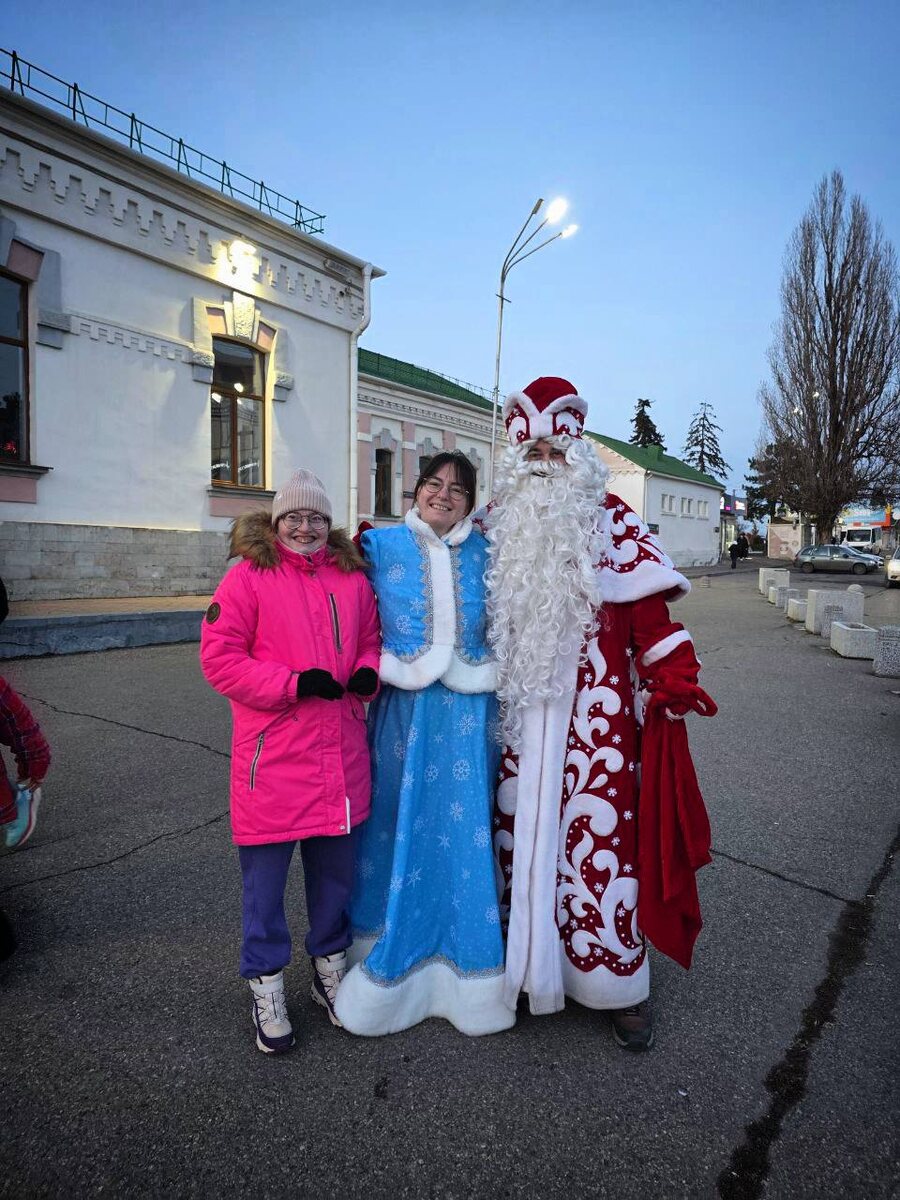 В таком приключении провожаем 2025 год 🥺 Ещё осенью Илона Вячеславовна спросила меня, где найти Деда Мороза в Ессентуках. Я сказала, что не знаю, но на Новый год полечу к родителям и смогу передать подарок ребёнку. Кира — художница, рисует по красные картины. Без шуток! Через время мы вернулись к этому разговору, я заказала подарки, созвонилась с мамой девочки и договорилась о встрече. Утром в день поздравления никакого Мороза у меня не было. А потом закрутилось… Позвонил один человек и сказал, что нашел костюмы, позвонил другой человек и сказал, что нашел Дедушку. За всей «витриной» и красивыми фотографиями, всегда ведется огромная невидимая работа. Она никогда не останавливается. Просто о ней никто не знает. В итоге: я топаю в магазин за конфетами, потом прыгаю в электричку, дальше на такси (120 рублей! Привет, мой 2007) — забираю огромные костюмы в Доме Культуры под честное слово. Беседую с милым дедушкой-охранником, все доброжелательные, хорошие, праздник там какой-то. Несусь