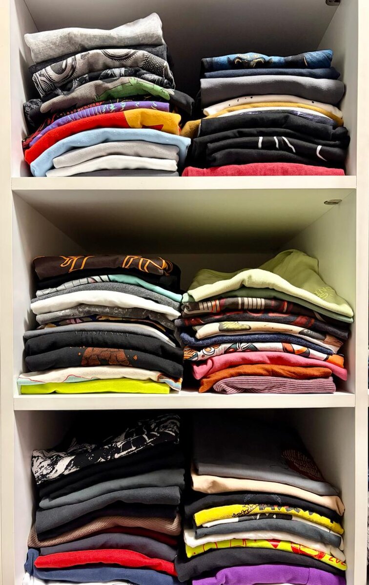 Итак, по итогам этого года в моем шкафу обрелось всего 75 футболок, и это только кажется что много, посмотрите как это скромно выглядит