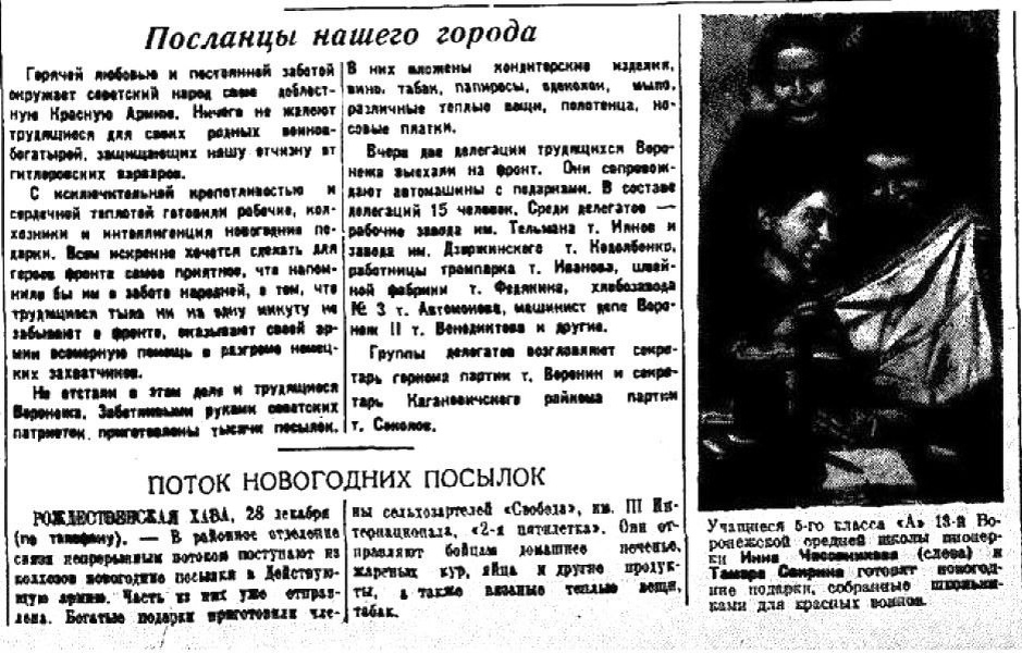 Интернет-канал TV Губерния совместно с историком Викторией Вырыпаевой представляют проект «Незнакомый город», на этот раз прочтем новогодние выпуски газеты «Коммуна» 1940-х годов. О чем писали журналисты тогда — в нашем материале. - О чем писали в «Коммуне» в самом конце 1941 года? В тяжелый для нашей страны 1941 год в газете «Коммуна» от 29 декабря того же года была опубликована заметка о делегации трудящихся города Воронежа в количестве 15 человек, которая сопровождала автомашины с подарками для бойцов Красной Армии. Среди делегатов – рабочие заводов города, возглавлял делегацию секретарь горкома партии товарищ Воронин и секретарь Кагановичского района партии товарищ Соколов (Кагановичский район находился в районе улиц Революции 1905 года, Комиссаржевской, проспекта Революции, улицы Помяловского и других. В состав района вошли, например, территория СХИ и посёлки, находившиеся на левом берегу реки Воронеж — прим. ред.). В этом же номере газеты «Коммуна» отмечалось, что «богатые подарк