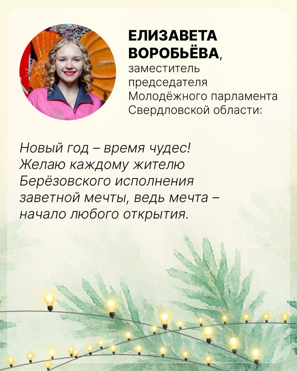 К поздравлениям присоединяется березовчанка Елизавета Воробьёва, заместитель председателя Молодёжного парламента Свердловской области, основательница проекта «Сила в семье».
