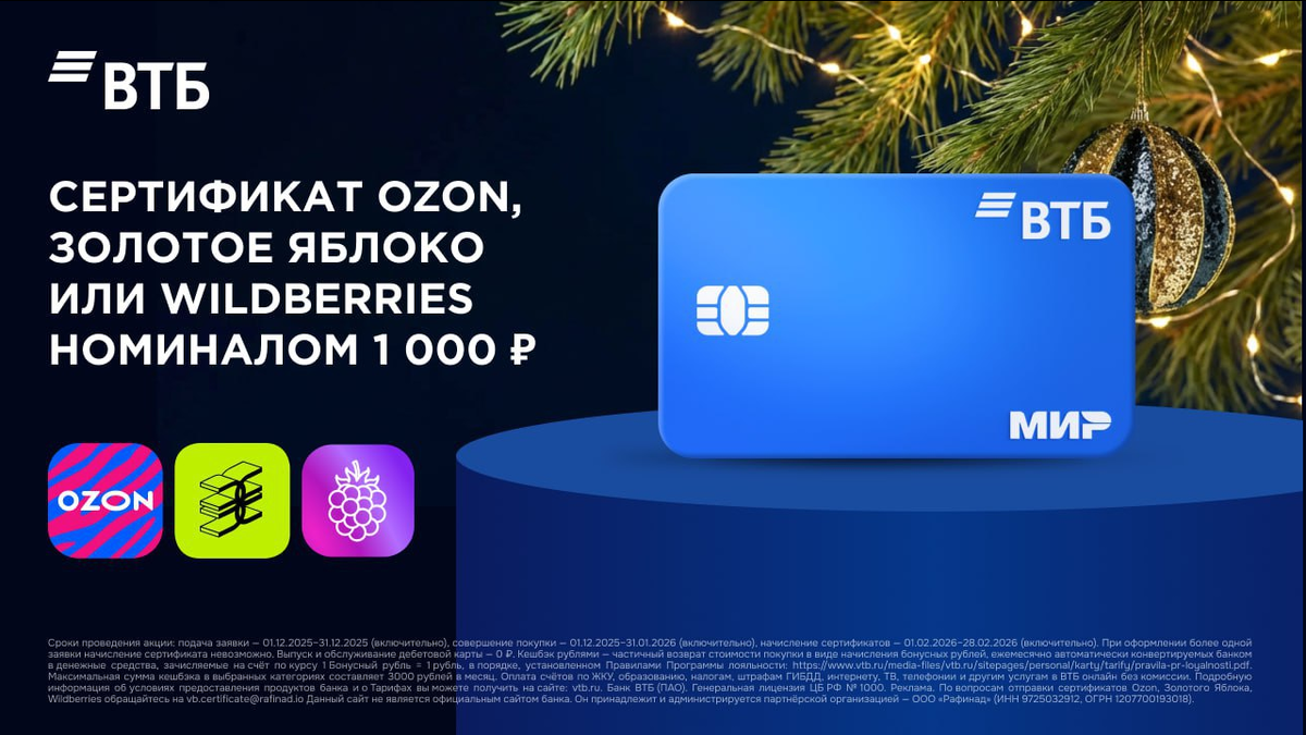 1️⃣ Оформить 31.12.25 карту по акционной ссылке 2️⃣ Получить в следующем году курьером либо в отделении банка 3️⃣ Сделать покупку от 500₽ до 31.01.26 🎁 Получаем сертификат на 1000₽ в OZON, WB или Золотое Яблоко (на выбор) Сертификат придет в СМС от партнера: vb.certificate@rafinad.io ☝️ В акции могут участвовать новые, и действующие клиенты без заявок на карты ВТБ с 02.09.25. Даже если карта уже есть, участвовать в акции можно! 🔥 Новым клиентам до конца года будет доступна доп. категория кэшбэка 100% на Супермаркеты, макс 1000₽/мес У меня уже есть пара карт ВТБ, ну пусть еще одна будет. Почему нет? 😂😂😂 👉 Получить 1000₽ за карту Важно!