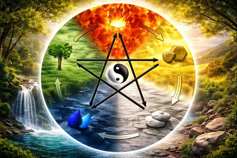 Пять стихий не «борются» между собой — они образуют цикл: каждая усиливает другую и сдерживает третью.