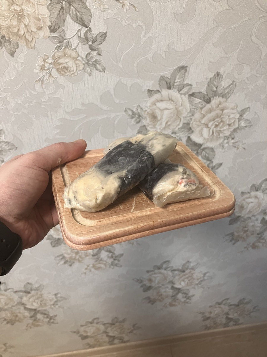 Далее рисовые листы замачиваем в воде и кладем 2 штуки внахлёст. Видно на последнем фото. Далее полоска листа нори повдоль и начинка.