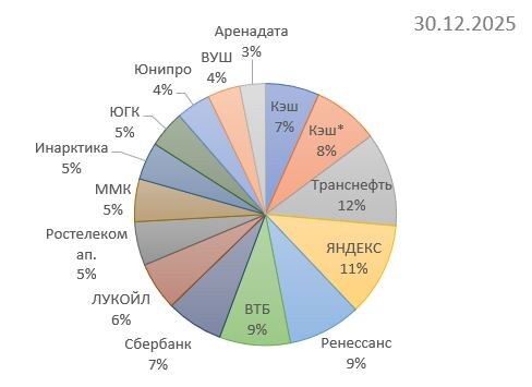 Итоги года, обзор портфеля, закрыл НКНХ и БСПБ ❌ НКНХ ($NKNCP) - открывал по 77.64, закрыл по средней 61.28, убыток -21% (с учетом дивидендов -17%). Причина закрытия описана здесь. Обидно, но что поделать, лось может и расти. Поскольку доля на портфель была 5%, то вышло менее 1% убытка. ❌ БСПБ ($BSPB) - открывал по 368, закрыл по средней 312, убыток -15% (с учетом дивидендов -3%). БСПБ заменил на Сбер, причина описана здесь. В принципе по текущей цене БСПБ можно было бы держать и дальше, но Сбер мне показался менее рисковым вариантом. Текущую структуру портфеля привожу на графике, комментарии ниже. Кэша 15% (Кэш* - это короткие облигации, которые можно конвертировать в кэш). 🟢 Транснефть ($TRNFP) и 🟢 Яндекс ($YDEX) - топ-позиции, держу. 🟡 Ренессанс ($RENI) - акция с минимальной волатильностью. Есть сомнения, нужна ли эта акция к ВТБ и Сберу, но пока держу до отчета, писал здесь. 🟢 ВТБ ($VTBR) - ставка на дивдоходность, 🟢 Сбер ($SBER) - на стабильность. Обе доли хочу довести