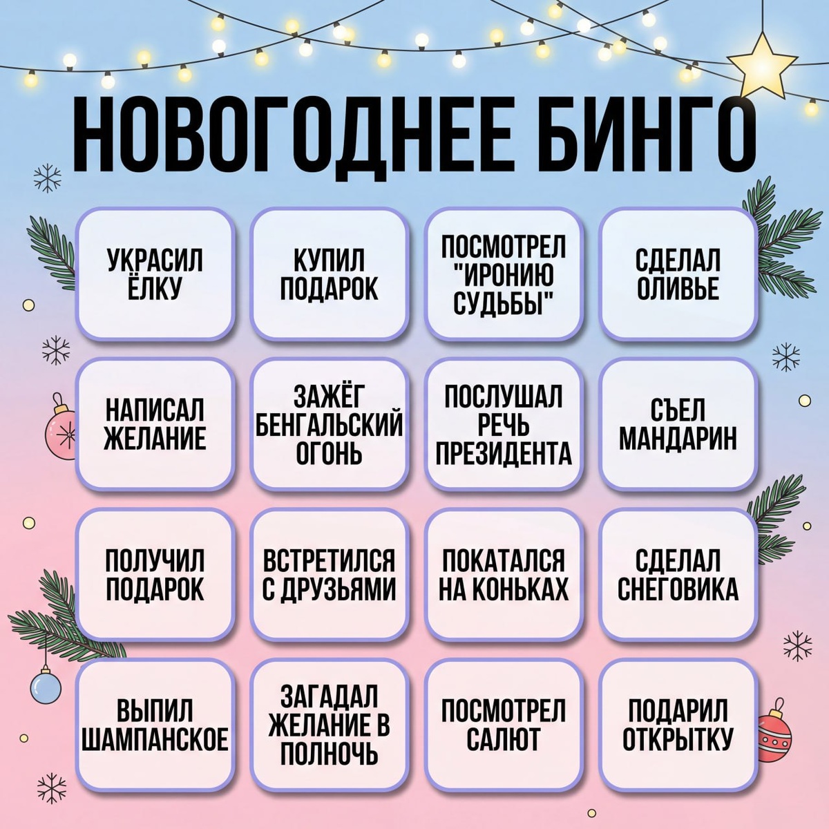 Давайте не дадим праздничным дням пролететь быстро и незаметно. Предлагаем выполнить бинго, наполнив дни интересными делами 😉