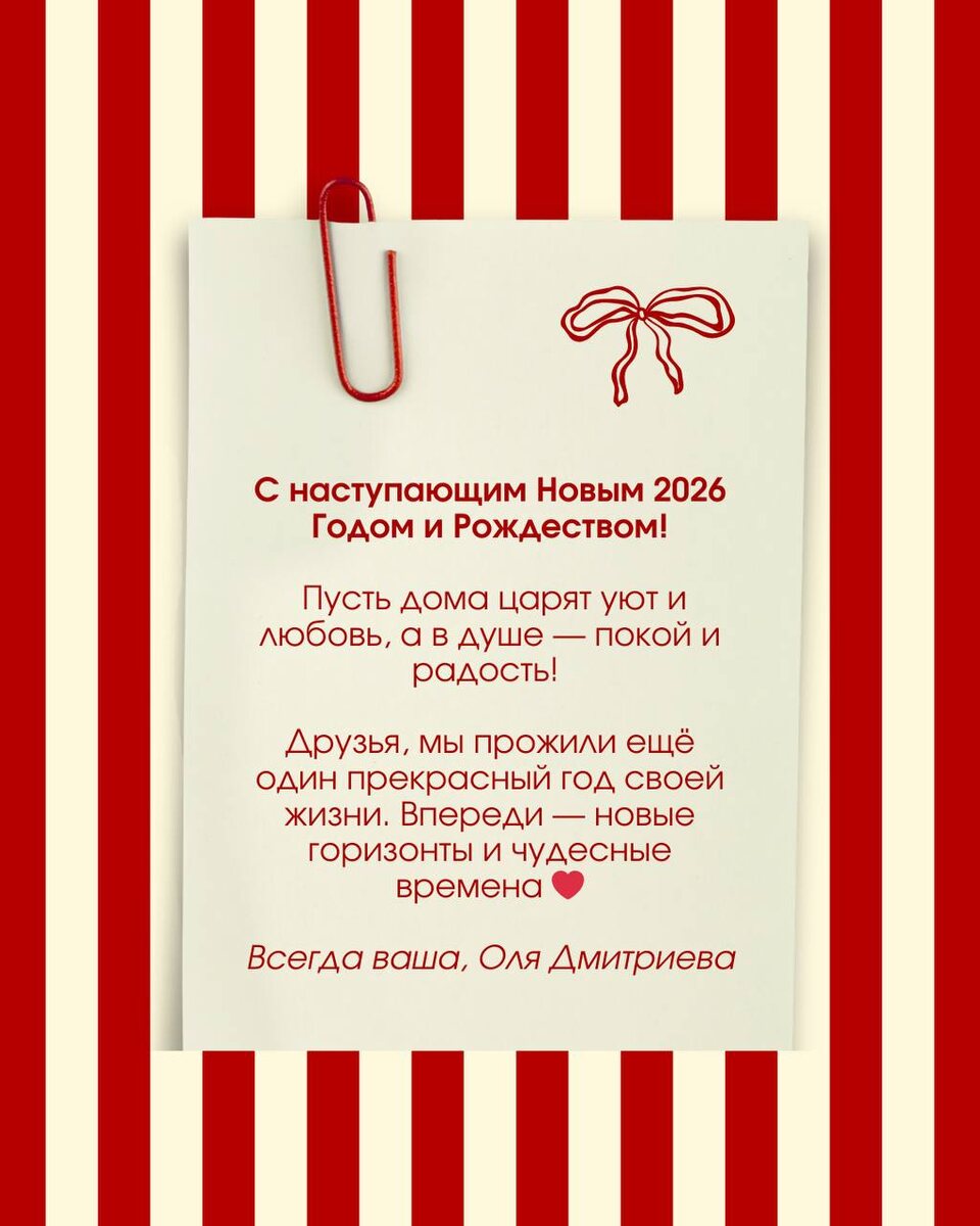 … 🎄 Ах, это волшебное время! С наступающим, друзья! Прекрасный был год, ну а дальше — как всегда, только лучше! Спасибо уходящему 2025-му! Ура наступающему 2026-му! Мы все-все обязательно будем счастливы! Отличных праздников и каникул 🫶 Будьте рядом с близкими и согревайтесь теплом друг друга 💛 Желаю вкусного застолья и желанных подарков! И загадать самые смелые желания, конечно! Дзыннннь! 🥂🍾