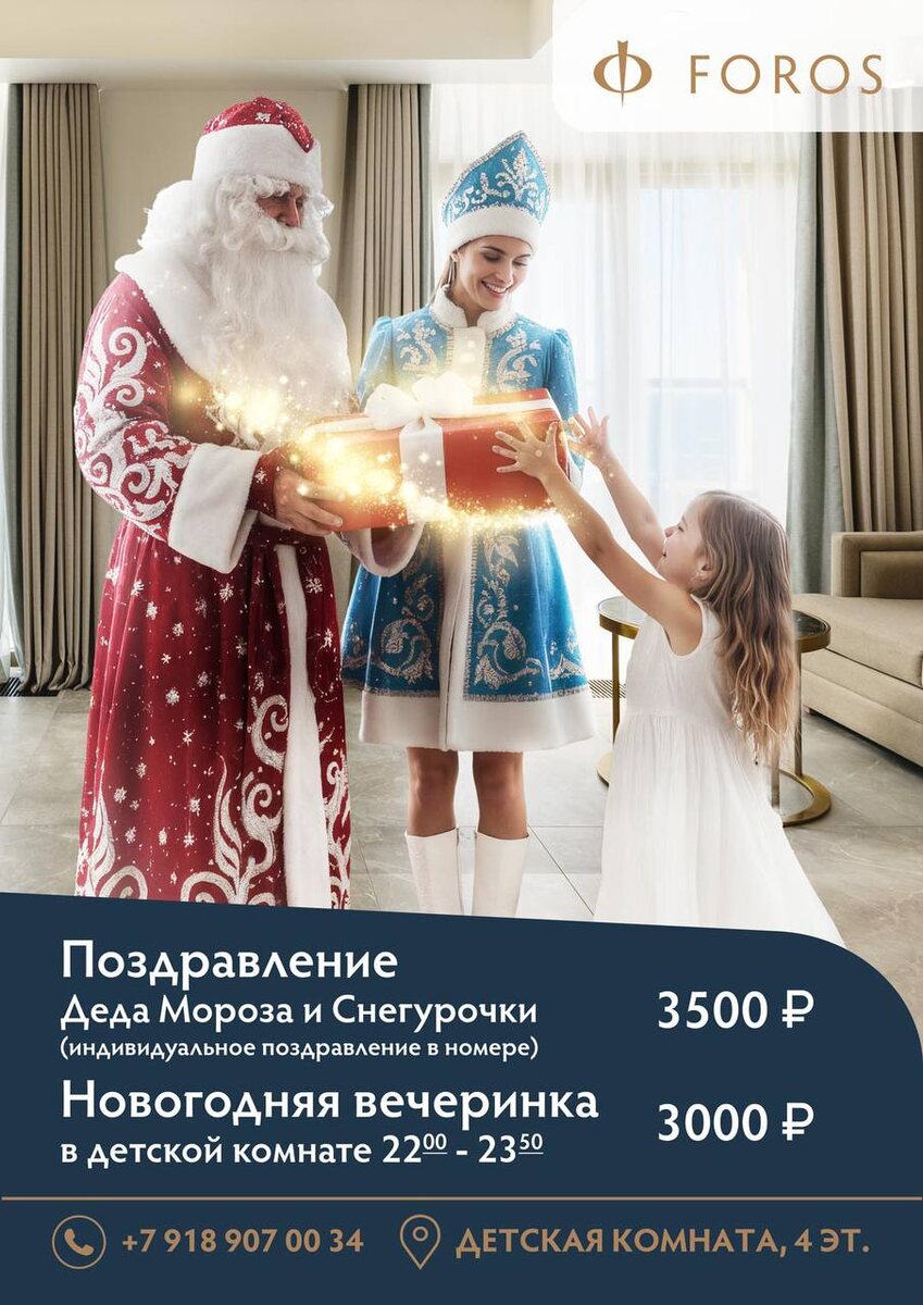 ✨ Подарите ребёнку настоящее чудо в новогодние праздники! Дед Мороз и Снегурочка лично поздравят вашего малыша прямо в номере, с подарком, волшебством и яркими эмоциями. 🎁 Индивидуальное поздравление в номере Дед Мороз и Снегурочка 💰 3500 ₽ 🎉 Новогодняя вечеринка в детской комнате Зимнее приключение для детей от 5 лет «Единорожек: волшебное новогоднее путешествие». 🕙 с 22:00 до 23:50 💰3000 ₽ 📍 Детская комната, 4 этаж 📞 +7 918 907 00 34 🎄Создайте незабываемые новогодние воспоминания для вашего ребёнка в санатории «Форос».