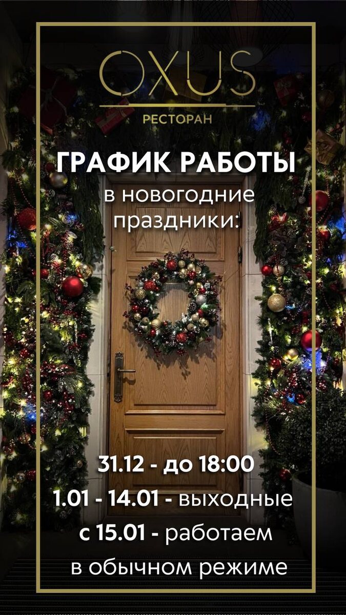 ! Дорогие гости! Поздравляем Вас с наступающим ✨Новым 2026 годом✨и благодарим, что были с нами в уходящем году! 31.12 мы работаем для Вас до 18:00, а с 01.01 по 14.01 уходим в праздничные выходные и встречаемся с Вами 15.01, в обычном режиме с 12:00 до 00:00. До новых встреч в Новом 2026 году!🌟🌟🌟 Ресторан OXUS +7(495) 681 80 00 +7(926) 307 86 86 (WA/TG) Сайт, telegram