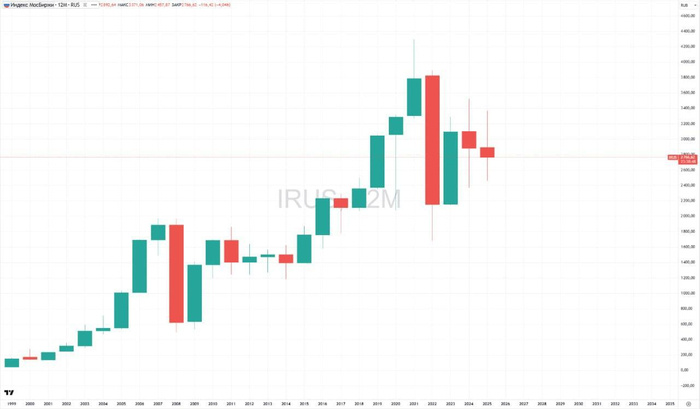 Российский рынок акций впервые с 1997-1998 годов упал второй год подряд. В 2024 году индекс Мосбиржи упал почти на 7%, а в 2025 году — чуть более чем на 4%. Подобное событие было отмечено более четверти века назад. По итогам 2025 года индекс Мосбиржи (IMOEX) снизился на 4,04%, опустившись с 2883,04 до 2766,62 пункта. В итоге бенчмарк второй год подряд закрывается в минусе, такого не было с 1997–1998 годов.Максимальным значением за год для индекса, который включает в себя акции 45 крупнейших российских эмитентов , стала отметка 3371,06 пункта в феврале. Минимум был достигнут в октябре, когда значение индекса опустилось до 2457,87 пункта.Индекс РТС (RTSI), который рассчитывается на основе суммарной долларовой рыночной капитализации акций, за 12 месяцев вырос на 24,73% — с 893,22 до 1114,13 пункта. Максимум по индексу в 2025 году был зафиксирован на уровне 1267,16 пункта, а минимум — на уровне 845,24 пункта. Также, с марта этого года торги на рынке акций Мосбиржи впервые стали проходить