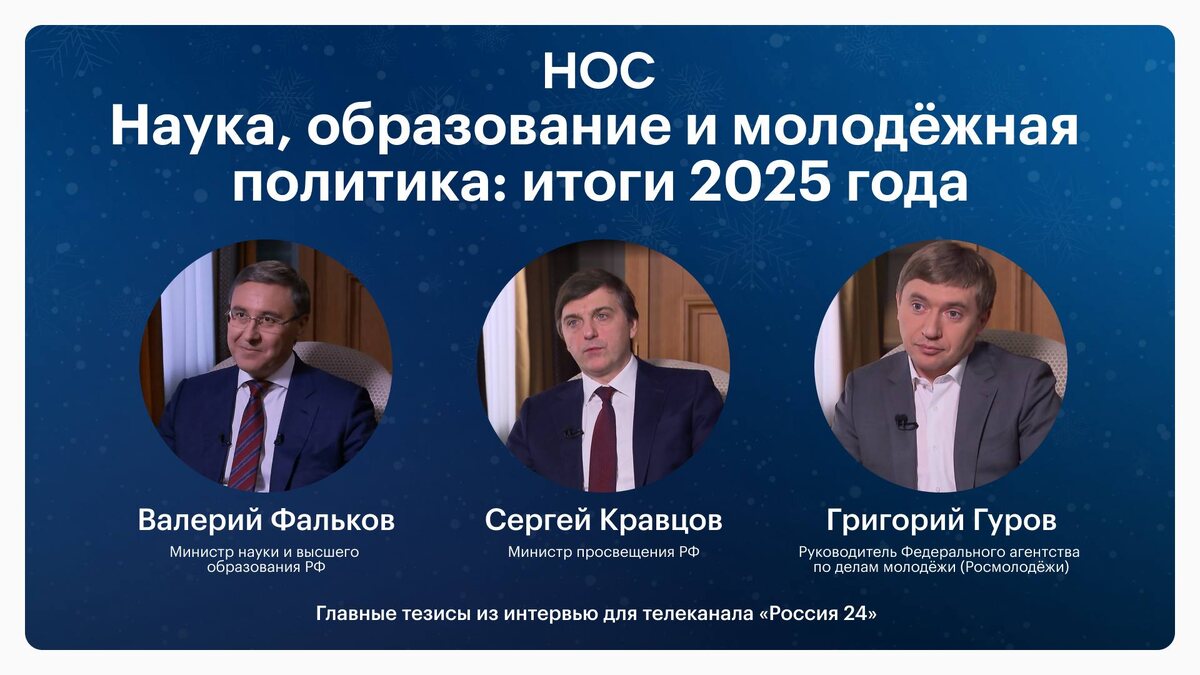 ⚡️ Наша редакция всегда активно следит за информационной повесткой. Телеканал «Россия 24» выпустил серию интервью с первыми лицами государства и представителями ведущих организаций. Мы решили собрать всё самое интересное в статье — в ней вы найдёте главное из следующих интервью ⬇️ ⏺ Валерий Фальков, Министр науки и высшего образования Российской Федерации — смотреть ⏺ Сергей Кравцов, Министр просвещения Российской Федерации — смотреть ⏺ Григорий Гуров, Руководитель Федерального агентства по делам молодёжи (Росмолодёжь) — смотреть Читайте статью на Платформе НОС 📱 ➡️ НОС: Телеграм | ВКонтакте | Платформа | МАХ