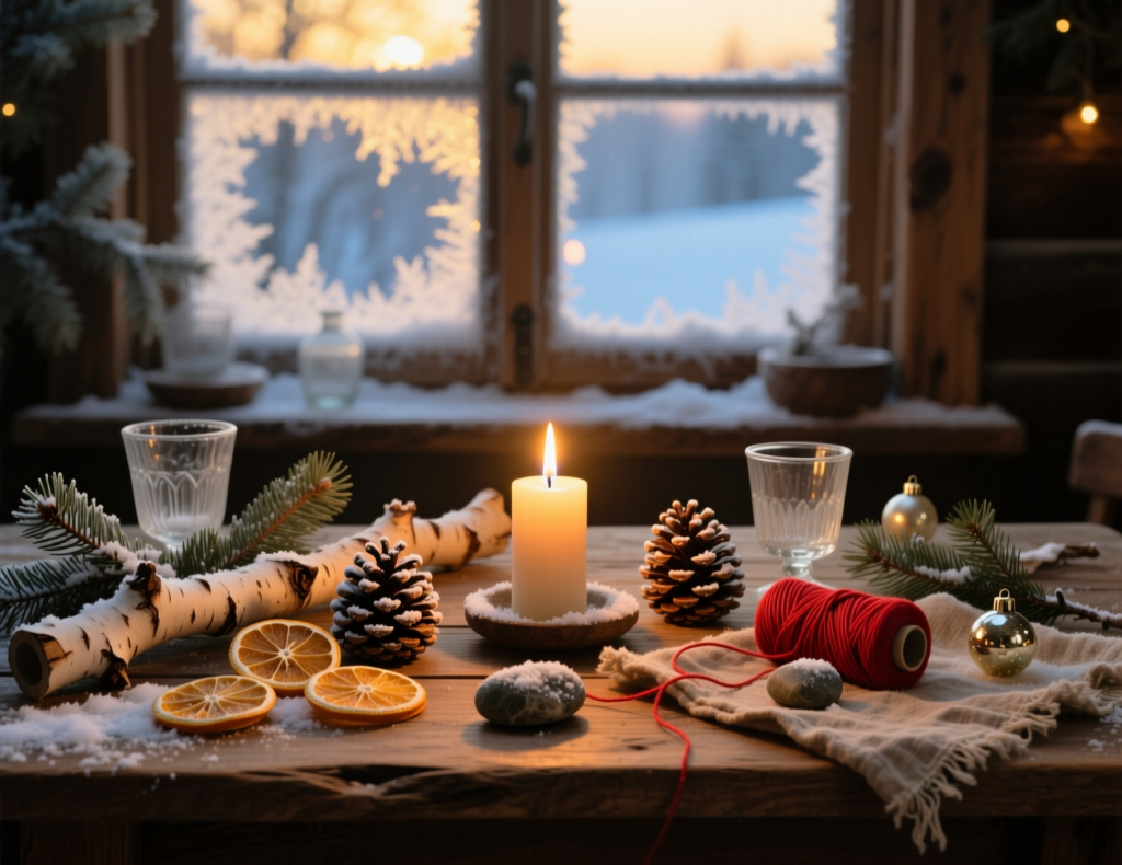 - Ёлка из калужских веток: Соберите красивые причудливые ветви (например, в роще «Калужский бор»), покройте их серебристой или белой аэрозольной краской (при желании) и составьте в высокую вазу, формируя конус. Украсьте минималистичными шарами или светодиодной гирляндой.