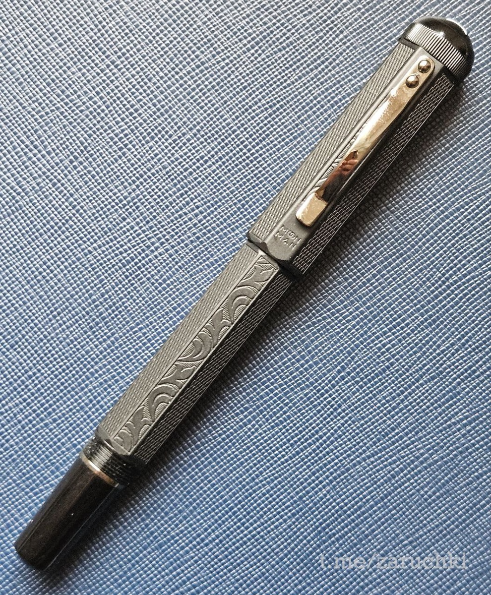 Это микс ручек Монблан - Лоренцо Медичи и Марсель Пруст. Есть общее от обоих, но в то же время сразу не похож целиком не на одну. У P138 есть разные вариации. Матовая черная мне показалась наиболее интересной и к тому же она наиболее отдалена от оригиналов. Я покупал модель не со стоковыми перьями Moonman, а со сторонними - с дополнительной заточкой. Я когда покупал не знал, какая в оригинале маска у Марселя и мне показалось, что часы подойдут к такой ручке. Как оказалось у Марселя тоже маска с часами. Заточка в переводе звучит как - маленький длинный меч. Что-то вроде короткого архитекта. В руке ручку держать не очень приятно. Резьба острая и ощущается пальцами и ступенька между секцией и барелем тоже. Также резьба и переход с обратной стороны давят на перепонку. Ручку хочется поскорее отложить в сторону. Колпак - 3.25 оборота. Можно вспомнить куплет из поэмы Лоренцо пока открутишь. Резьба без заеданий, но не абсолютно плавная и одинаковая на всём пути. Какое-то побулькивание легк
