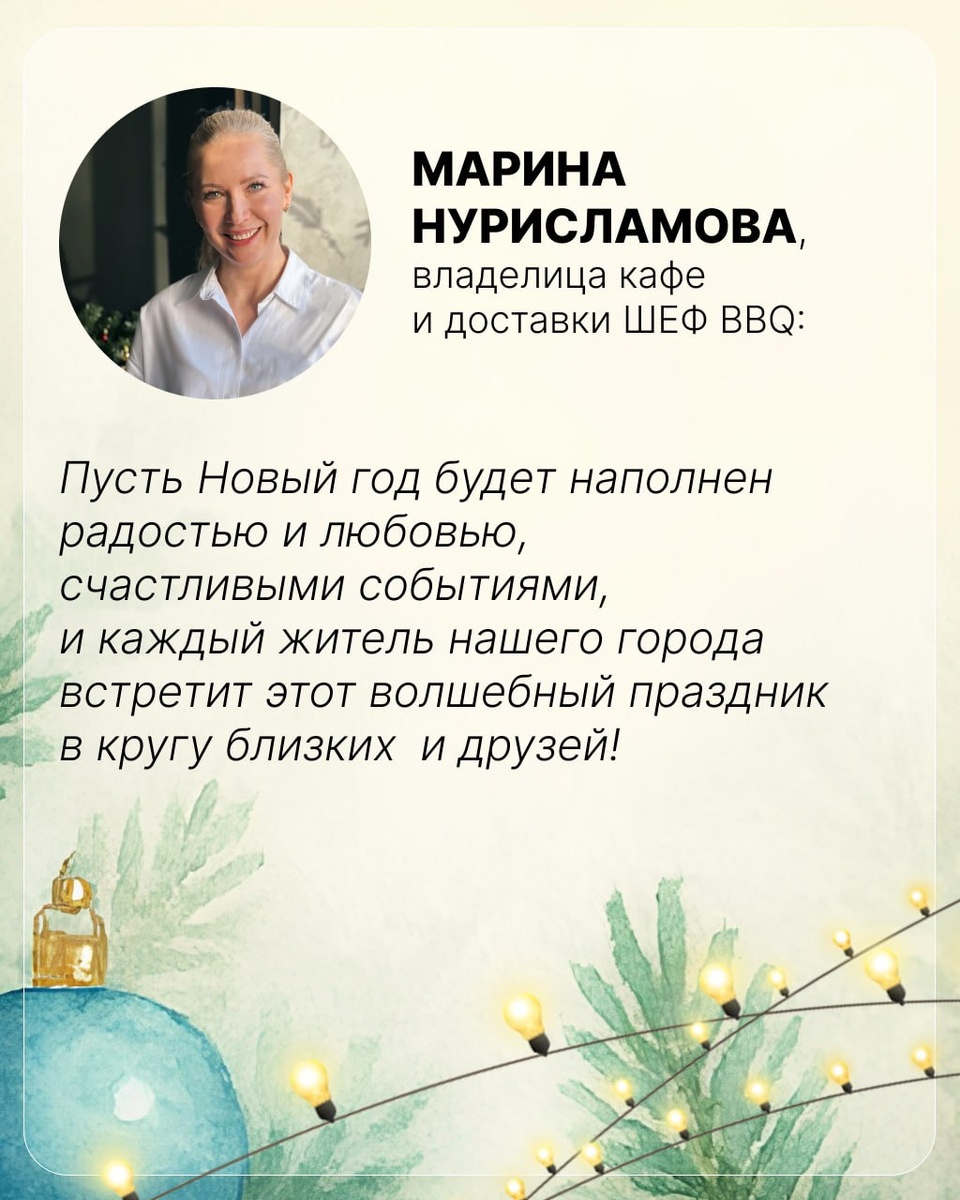 Владелица кафе и доставки Шеф BBQ Марина Нурисламова желает всем березовчанам встретить праздник в кругу родных и близких.