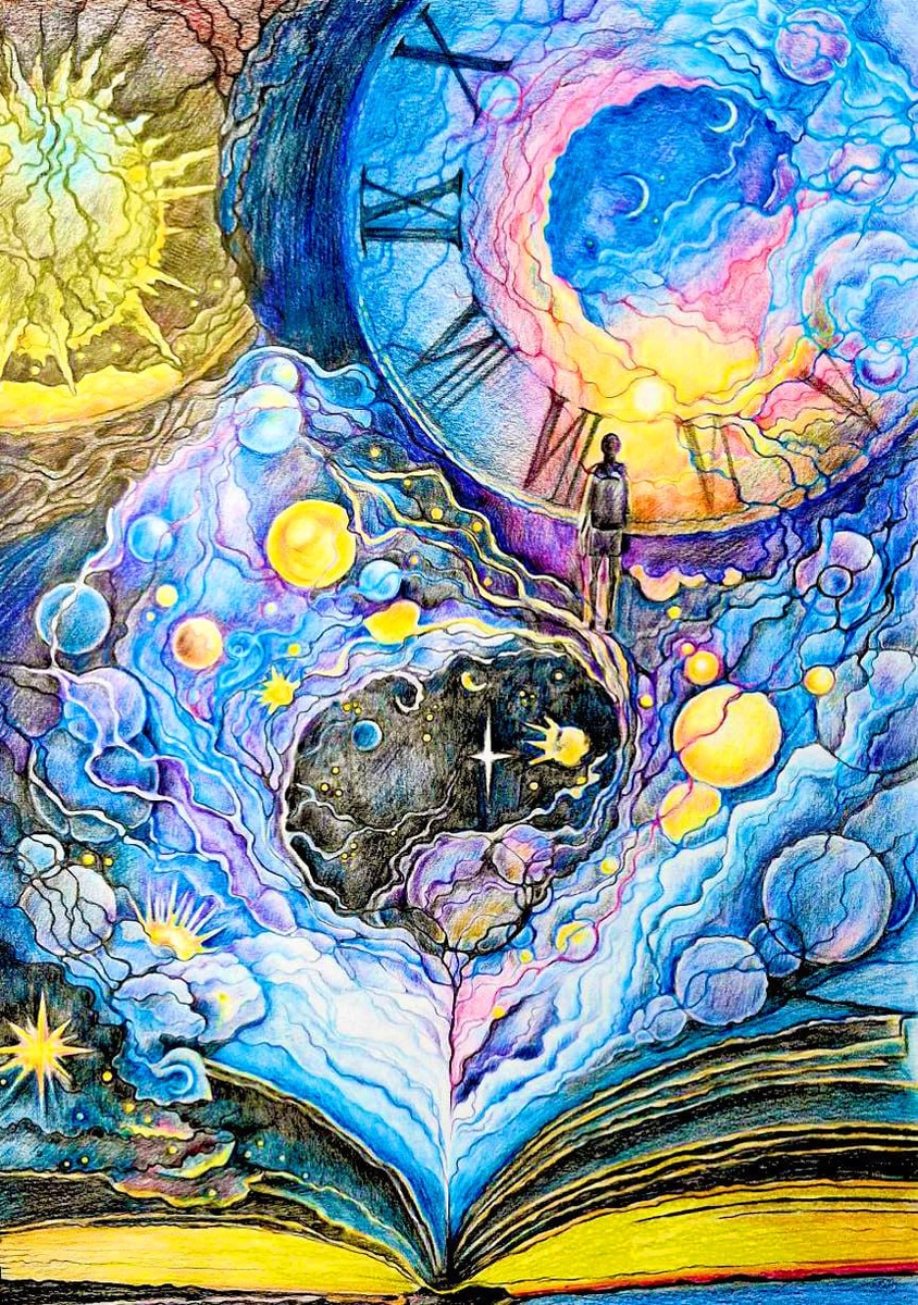 Рисунок Нелли Измайловой, иллюстрация на текст Алены Солоповой. Люди в масштабе Вселенной всего лишь песчинки, которые ищут время Благодарю автора текста🔥 Целую неделю я рисовала Вселённую Возможностей. Записывала мысли, которые у меня появлялись во время рисования и вот что получилось. Люди и время – это два взаимосвязанных понятия, которые часто используются в контексте возможностеий и перспектив. Время – это то, что мы имеем для реализации своих целей и мечтаниий. Люди – это те, кто может помочь нам достичь наших целей, использовать наши возможности и сделать нашу жизнь более значимой. Во Вселенной человек как песчинка в пустыни и как буква в книге. Возможности – это то, что предоставляет нам время и люди. Возможности могут быть различными, от возможности получить образование до возможности путешествовать по миру. Вселенная также предоставляет нам возможности, которые мы можем использовать для достижения своих целей. Книга – это еще один инструмент, которыи может помочь нам