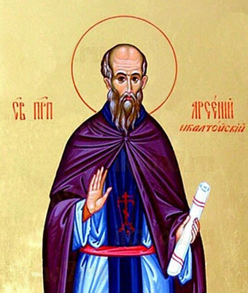 Преподобный Арсений Икалтойский происходил из грузинского княжеского рода Вачнадзе. Он родился в Кахетии (Восточная Грузия), по некоторым данным, в селении Икалто. Воспитанный благочестивыми родителями, преподобный Арсений с детства отличался любовью к церковным службам и молитве. Духовное образование он получил в Константинопольской академии, где глубоко изучил не только богословие, но и естественные науки. По окончании академии принял монашество и нес послушание в одном из грузинских монастырей Черной горы (близ Антиохии), под руководством святого Ефрема Мцире († 1101; память 18 (31) января). Здесь преподобный Арсений ревностно занимался богословской и переводческой деятельностью, исследуя, в частности, причины отпадения нехалкидонских Церквей от Православия.