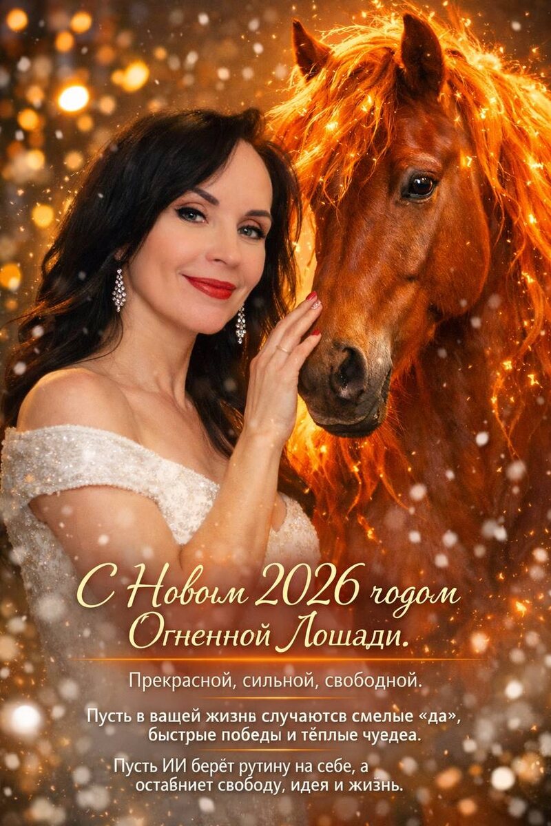 Я хочу сказать вам всем СПАСИБО, что вы были со мной, читали мой канал и разделяли со мной все мой радости и достижения. Наступает год огненной лошади ииии ❤️ Пусть она пронесётся по вашей жизни не разрушением, а очищением: сжигает сомнения, страхи и лишнее, оставляя только настоящее. ❤️ Пусть в вашей жизни случаются прорывы без надрыва: когда всё складывается быстро, чисто и в вашу пользу. ❤️Пусть огонь будет топливом, а не пожаром, чтобы вы горели идеей, а не выгорали. ❤️А ИИ пусть станет вашим магическим помощником 🙂 ❤️ Пусть этот год будет про свободу, силу и красивый разгон. 🎄 Пусть здоровье будет крепким, счастье - ежедневным, а поводов обнять своих близкий больше, чем поводов переживать. Автор: Яна Матвеева Нейропоток