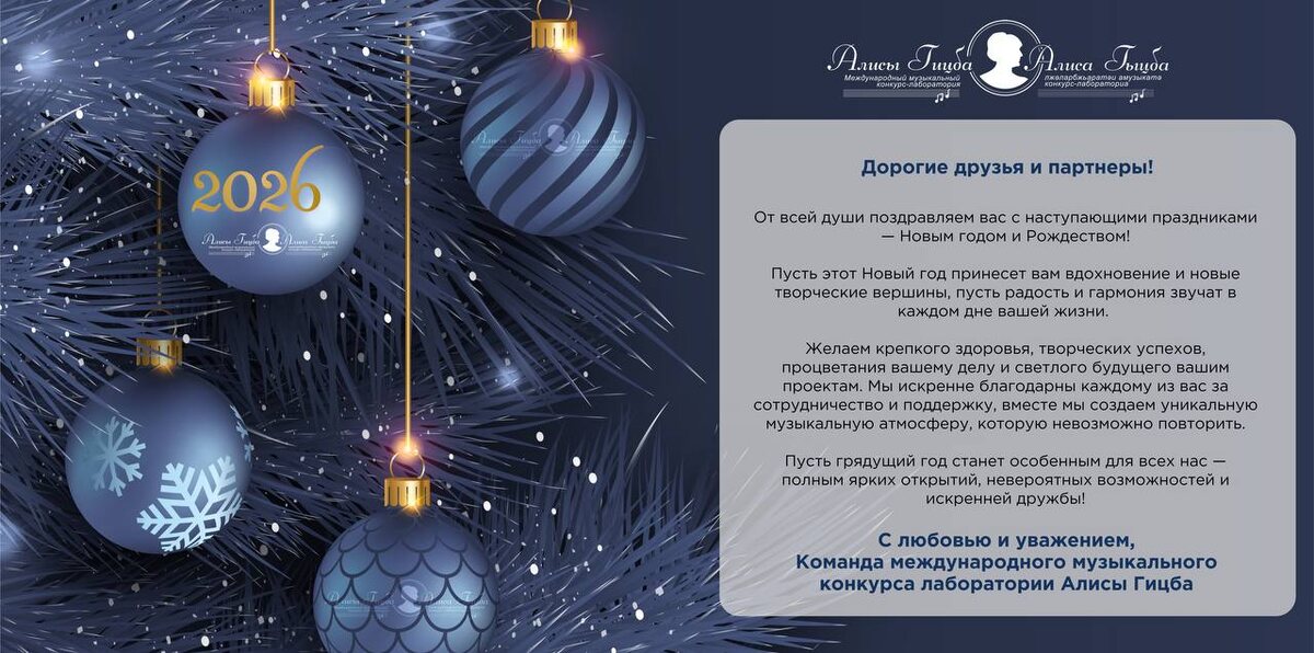 ! 🎄 От всей души поздравляем Вас с наступающими праздниками — Новым годом и Рождеством! 🎼 Пусть этот Новый год принесет Вам вдохновение и новые творческие вершины, пусть радость и гармония звучат в каждом дне Вашей жизни. 🎉 Желаем крепкого здоровья, творческих успехов, процветания Вашему делу и светлого будущего вашим проектам. Мы искренне благодарны каждому из Вас за сотрудничество и поддержку, вместе мы создаем уникальную музыкальную атмосферу, которую невозможно повторить. 🎁 Пусть грядущий год станет особенным для всех нас — полным ярких открытий, невероятных возможностей и искренней дружбы! ♥️ С любовью и уважением, Команда международного музыкального конкурса лаборатории Алисы Гицба НАШИ ПАРТНЕРЫ: ➡️ Генеральный информационный партнер проекта – государственное информационное агентство ТАСС. Информационные партнеры конкурса: ➡️ Российский государственный музыкальный телерадиоцентр «Орфей» ➡️Абхазская государственная телерадиокомпания АГТРК ➡️ Спутник Абхазия ➡️ Апсныпр
